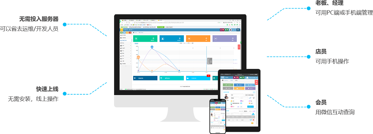 產品進銷存、短信營銷、移動收款、多級會員、報表統計公眾號推送、一鍵算提成